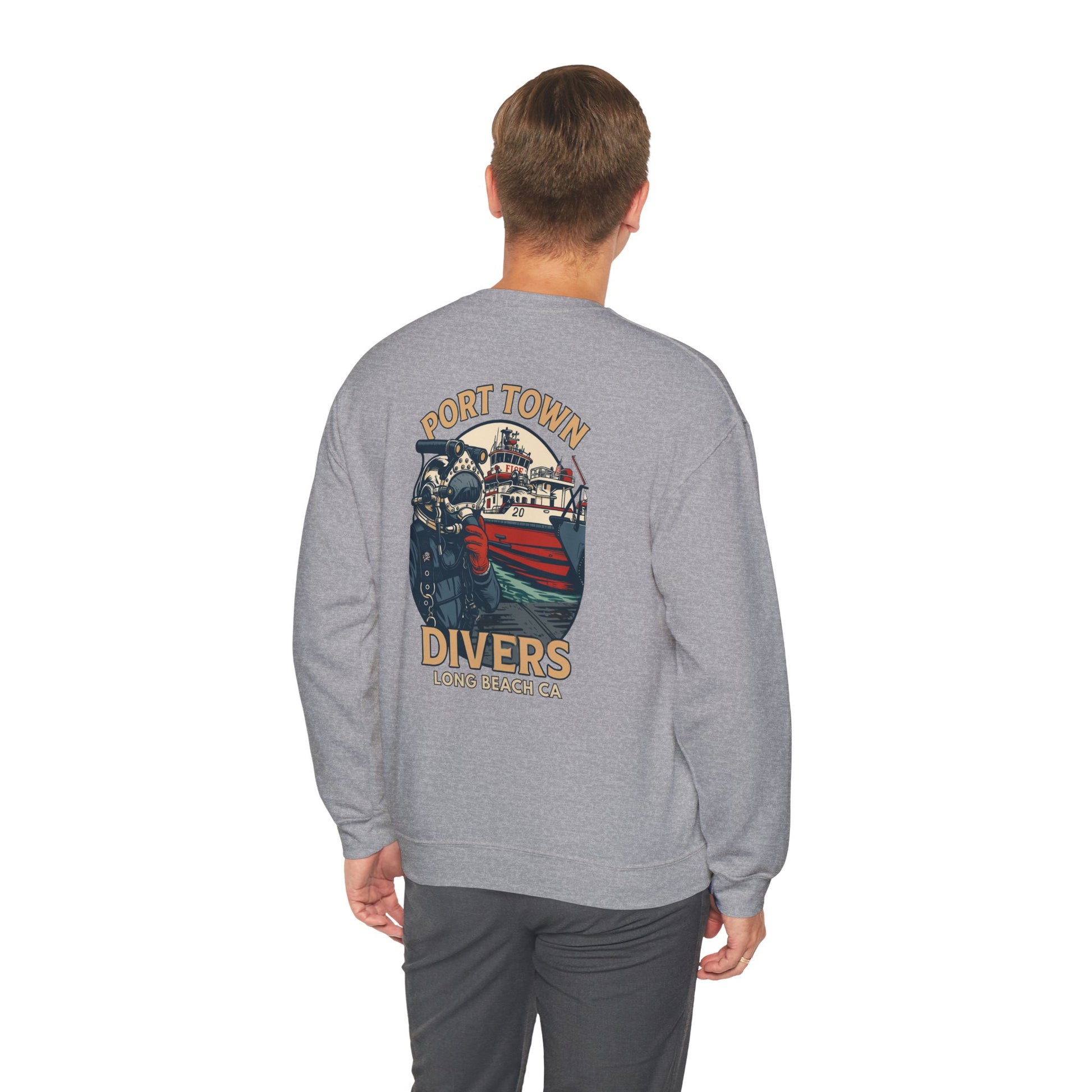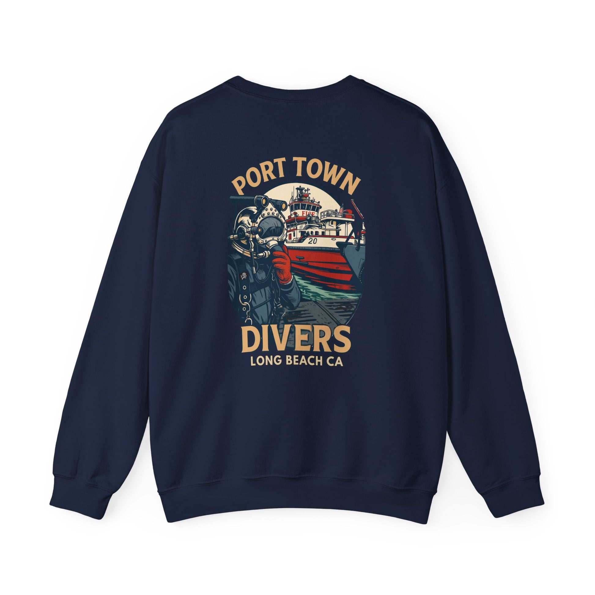 Stay warm in the official Port Town Divers crewneck featuring a vintage commercial diver and Long Beach Fireboat 20. Soft, durable, and perfect for harbor life.